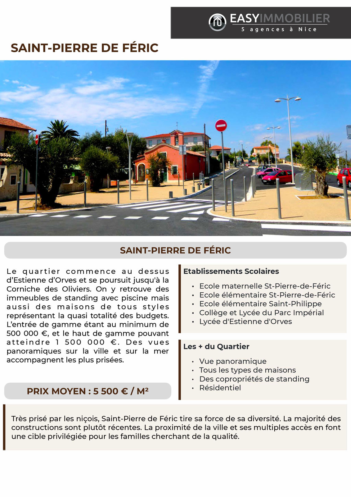 Très prisé par les niçois, Saint-Pierre de Féric tire sa force de sa diversité. La majorité des constructions sont plutôt récentes. La proximité de la ville et ses multiples accès en font une cible privilégiée pour les familles cherchant de la qualité.